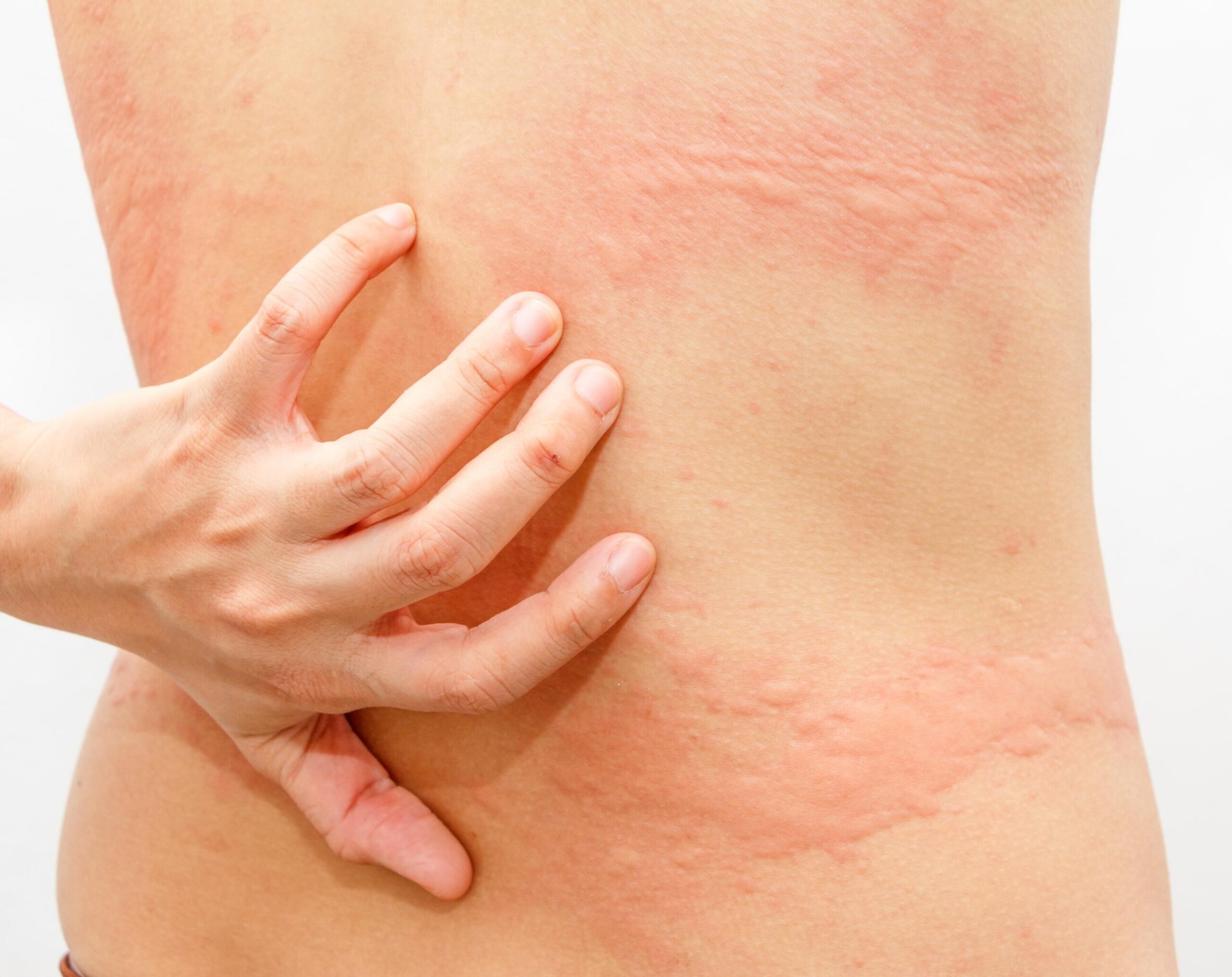 - Itchy red or skin-colored welts (hives)